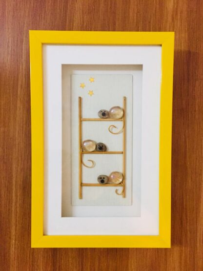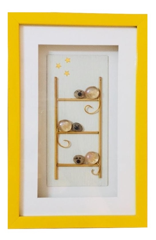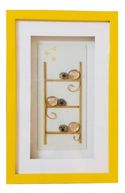 Handmade artwork gift item of stones on wood featuring “Life with Love” kittens on a bunker bed. This is a perfect personalized piece of art to possess or gift to someone you love. The desire of the maker is to give the owner of the artwork special memories of our lives made from unique elements from mother earth.